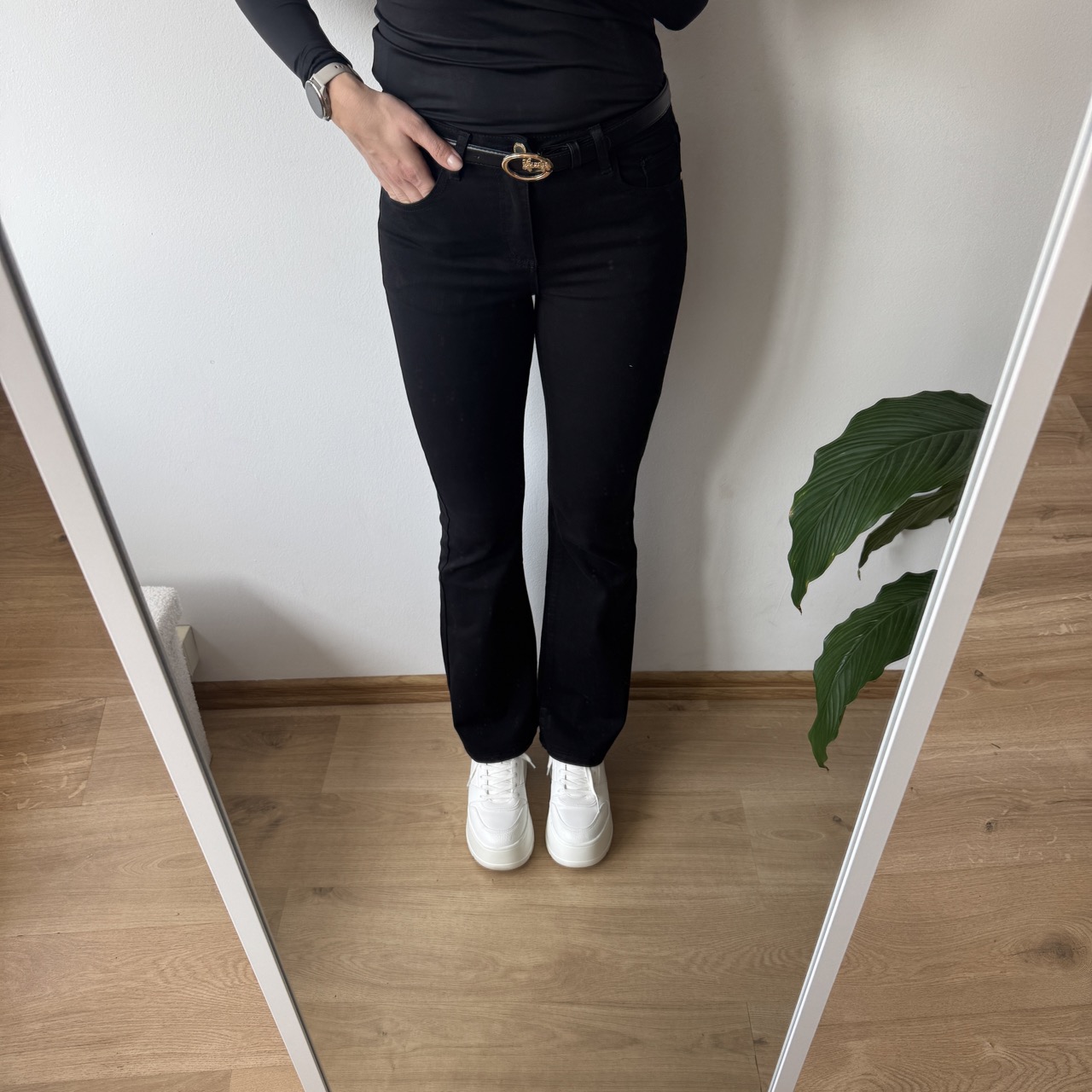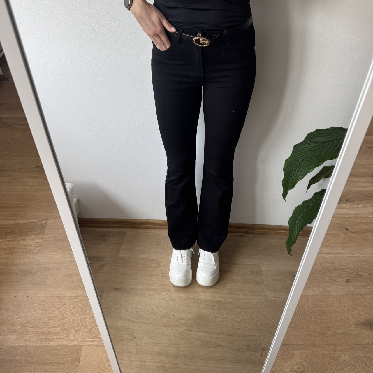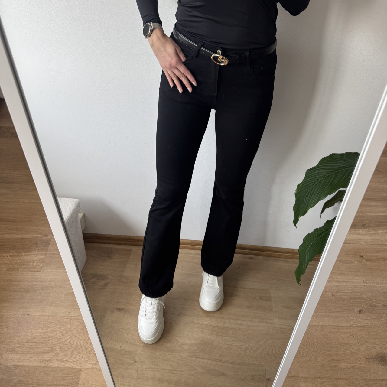 W zestawie pasek ze złotą klamrą, który elegancko dopełnia całość stylizacji. Spodnie wykonane z przyjemnego w noszeniu materiału – idealne zarówno do codziennych, jak i bardziej eleganckich zestawów.