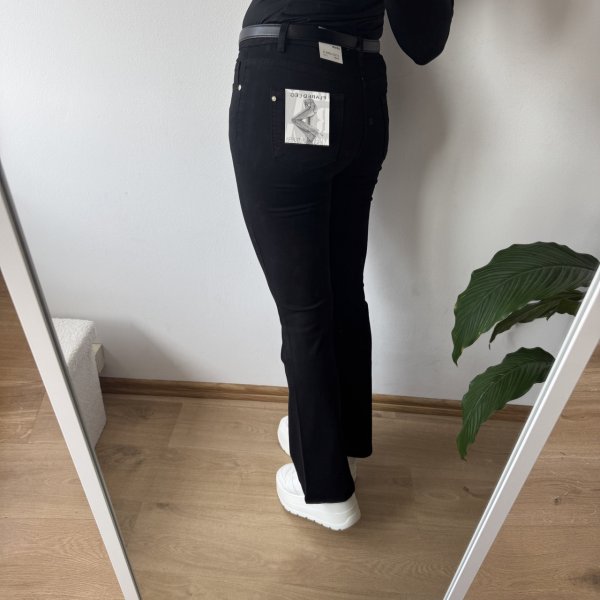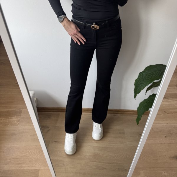 Stylowe spodnie typu dzwony od Msara w klasycznym czarnym kolorze. Model ze średnim stanem, który świetnie podkreśla talię i zapewnia wygodę noszenia. Nogawki lekko rozszerzane ku dołowi nadają sylwetce smukłości i modnego charakteru.