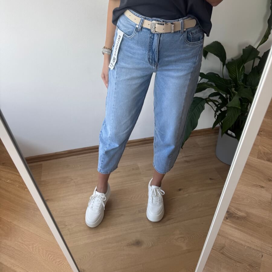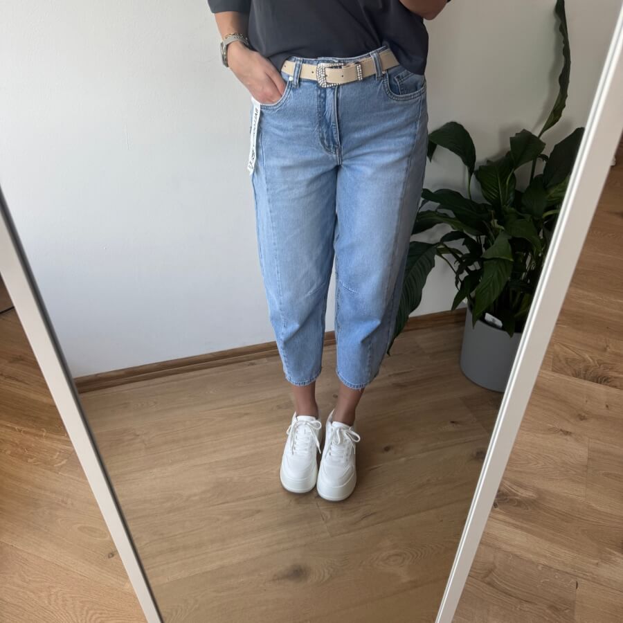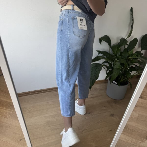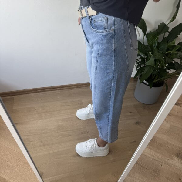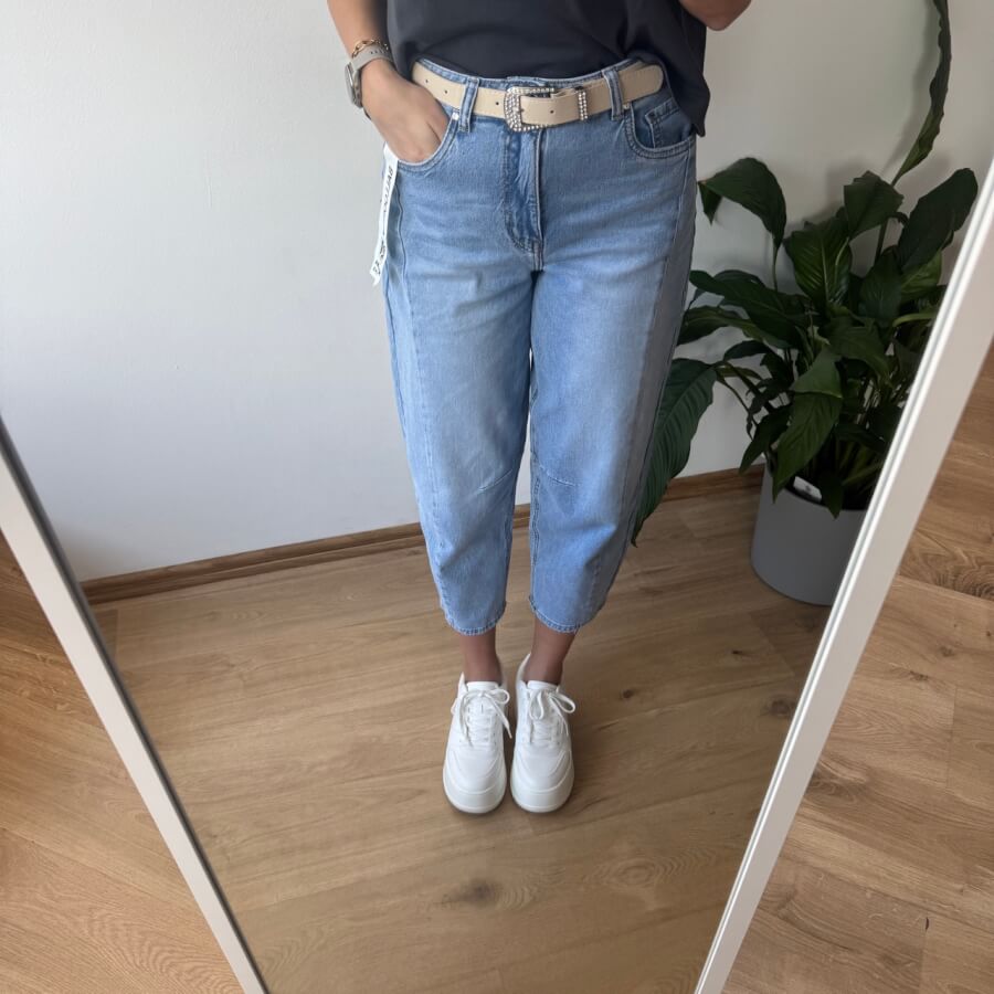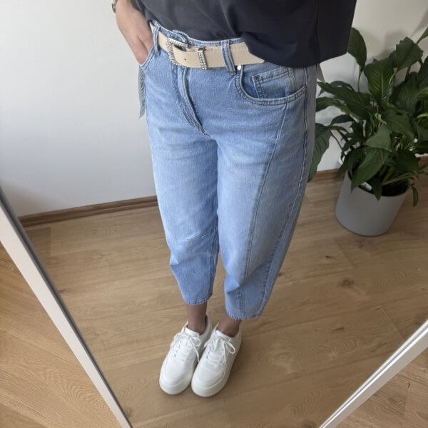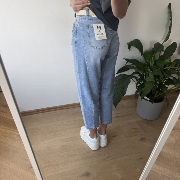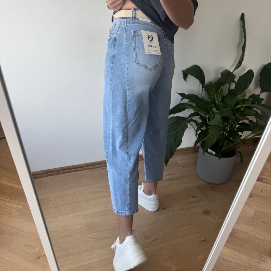 Jeansy MSara w fasonie balloon jeans to nowoczesne połączenie wygody i stylu. Charakterystyczne, lekko zaokrąglone nogawki z przeszyciami wzdłuż długości optycznie wysmuklają i modelują sylwetkę. Wysoki stan pięknie podkreśla talię, a długość 7/8 eksponuje kostki i świetnie komponuje się zarówno z trampkami, jak i botkami. Uszyte z lekko spranego denimu, mają swobodny, casualowy charakter, idealny na co dzień.