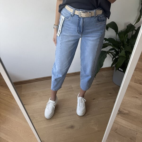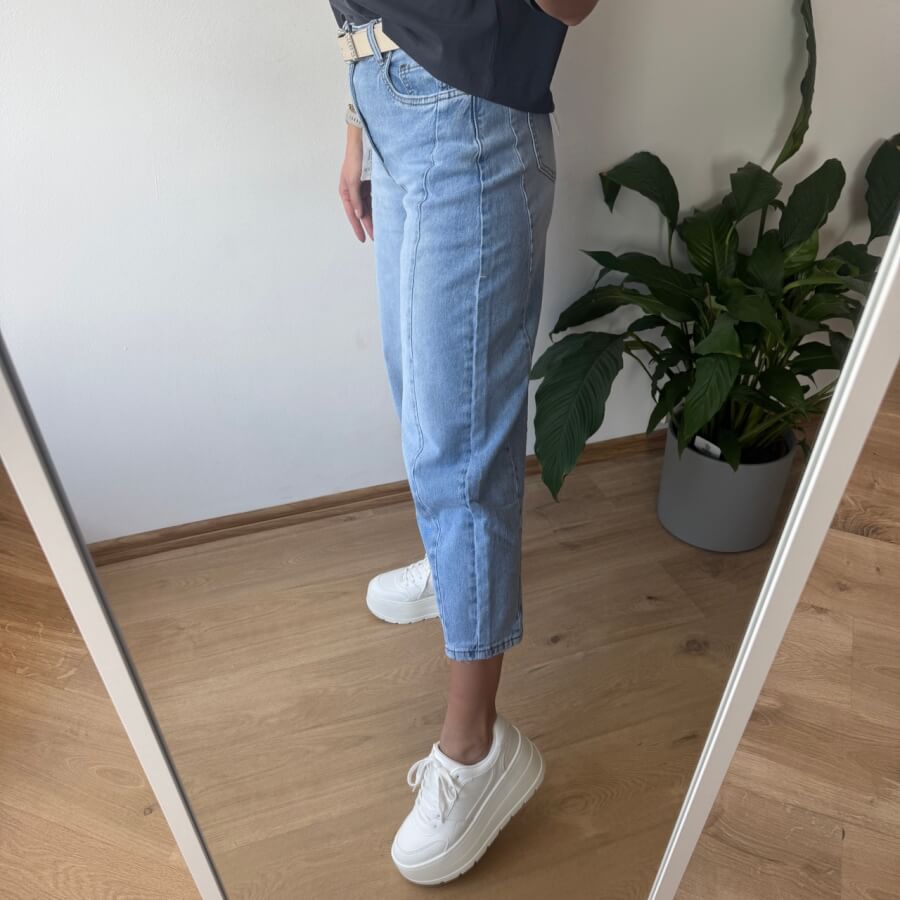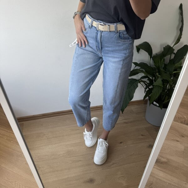 Jeansy M.Sara Momfit – wysoki stan, elastyczny materiał, stylowe przetarcia i pasek w zestawie. Idealne dopasowanie i piękny jasny odcień jeansu. Rozmiary XS-XL. Wybierz swój styl już teraz!