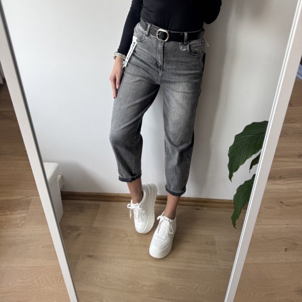 Stylowe jeansy w grafitowym odcieniu z efektem szarego melanżu. Wykonane z bardzo miękkiego i przyjemnego w dotyku materiału, który jest elastyczny i zapewnia wysoki komfort noszenia. Model z bardzo wysokim stanem, który pięknie podkreśla talię.