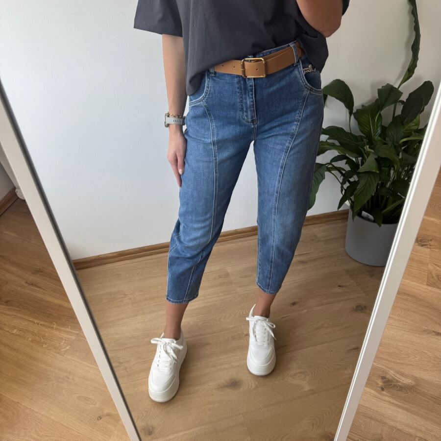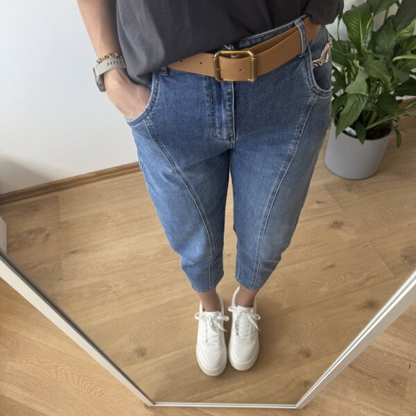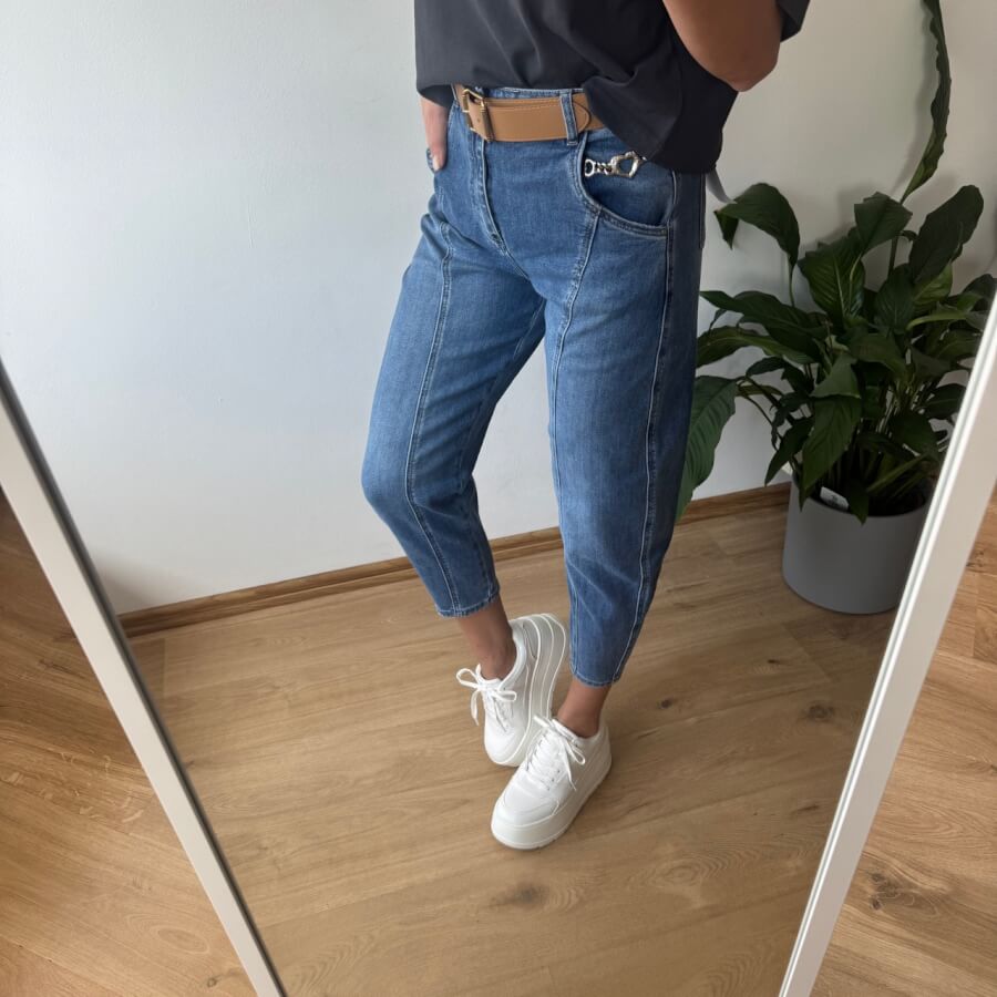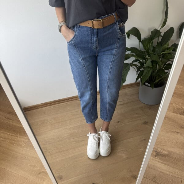 Jeansy MSara w fasonie balloon jeans to nowoczesne połączenie wygody i stylu. Charakterystyczne, lekko zaokrąglone nogawki z przeszyciami wzdłuż długości optycznie wysmuklają i modelują sylwetkę. Wysoki stan pięknie podkreśla talię, a długość 7/8 eksponuje kostki i świetnie komponuje się zarówno z trampkami, jak i botkami. Uszyte z lekko spranego denimu, mają swobodny, casualowy charakter, idealny na co dzień.