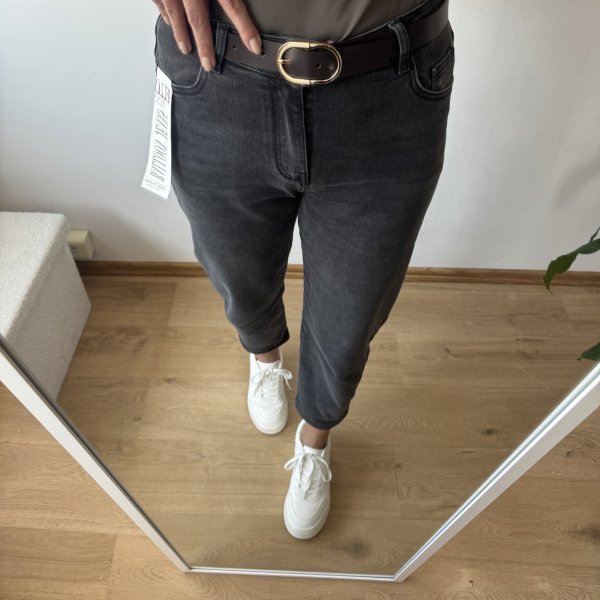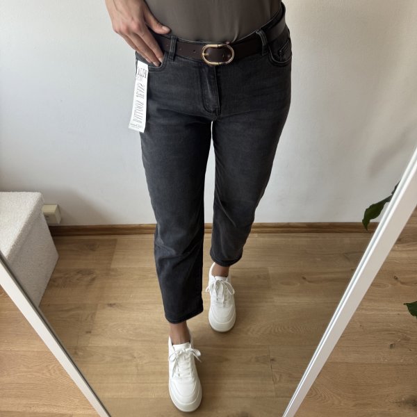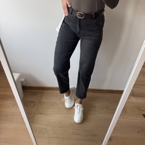 Spodnie wykonane są z miękkiego i elastycznego denimu, dzięki czemu świetnie dopasowują się do ciała i zapewniają komfort noszenia przez cały dzień. Grafitowy kolor sprawia, że model jest bardzo uniwersalny i łatwo dopasować go do wielu stylizacji – od codziennych po bardziej eleganckie.