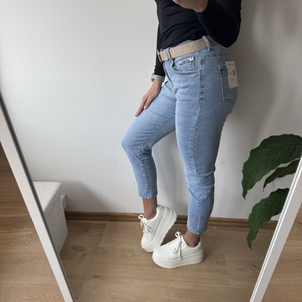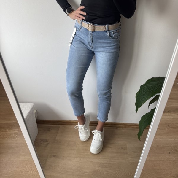 Stylowe jeansy typu mom fit wykonane z miękkiego i elastycznego denimu, który zapewnia wygodę i świetne dopasowanie do sylwetki. Model w jasnym, chłodnym odcieniu jeansu idealnie wpisuje się w nowoczesne i świeże stylizacje.