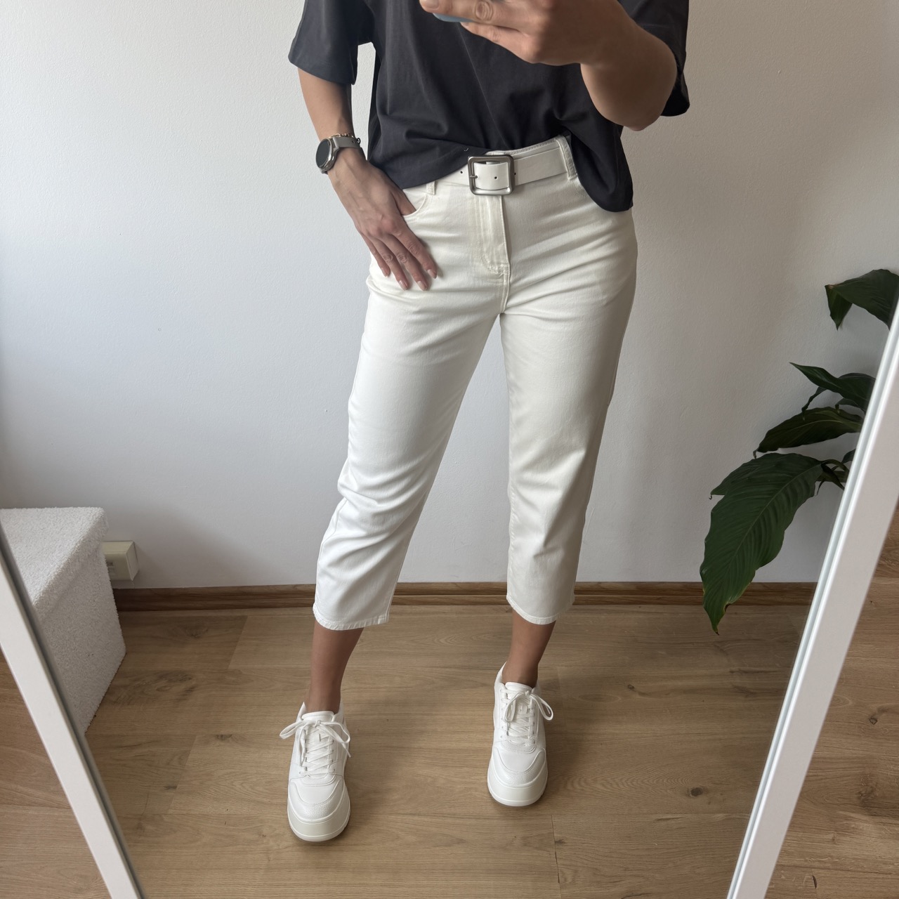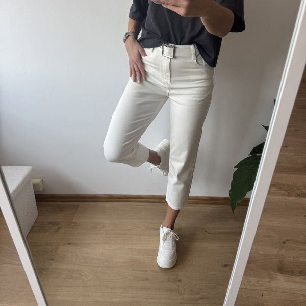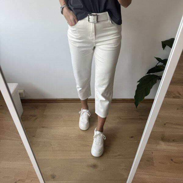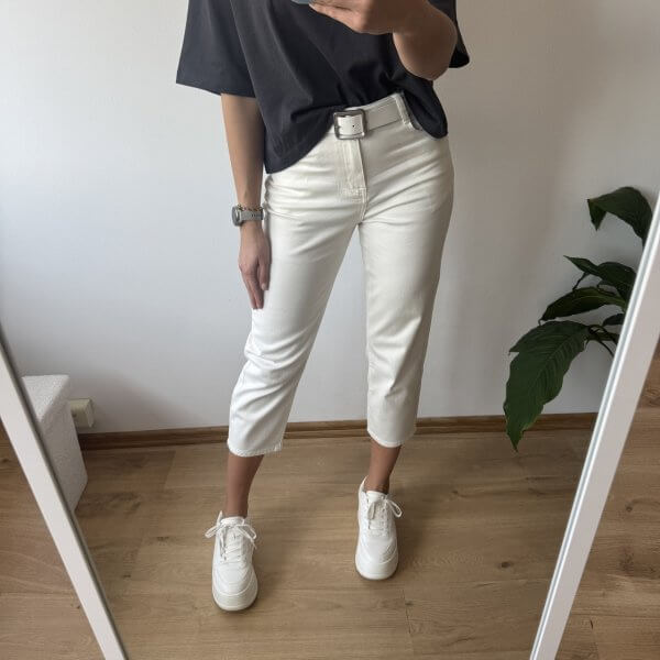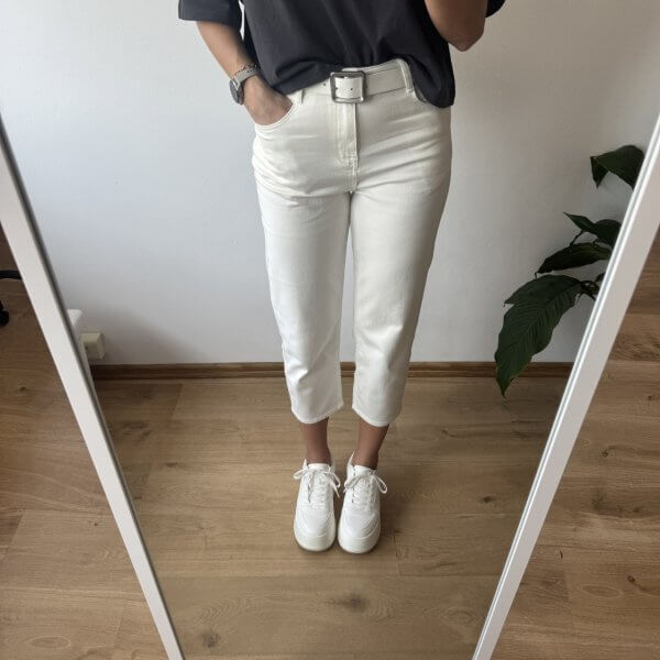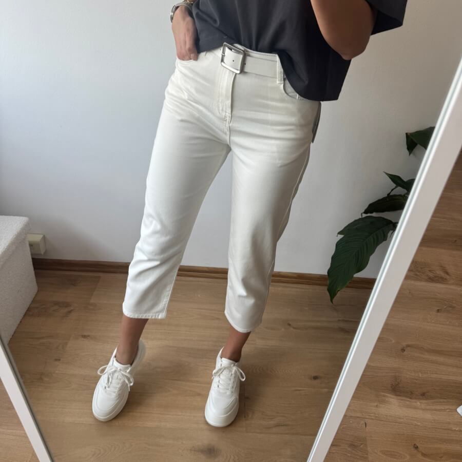 Wyższy stan świetnie podkreśla talię i zapewnia wygodę noszenia przez cały dzień. Wykonane z miękkiego, cieńszego denimu, są lekkie i przyjemne w dotyku – idealne także na cieplejsze dni. Subtelny biały kolor dodaje stylizacji delikatności i świeżości.