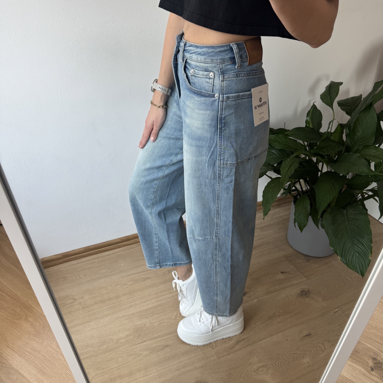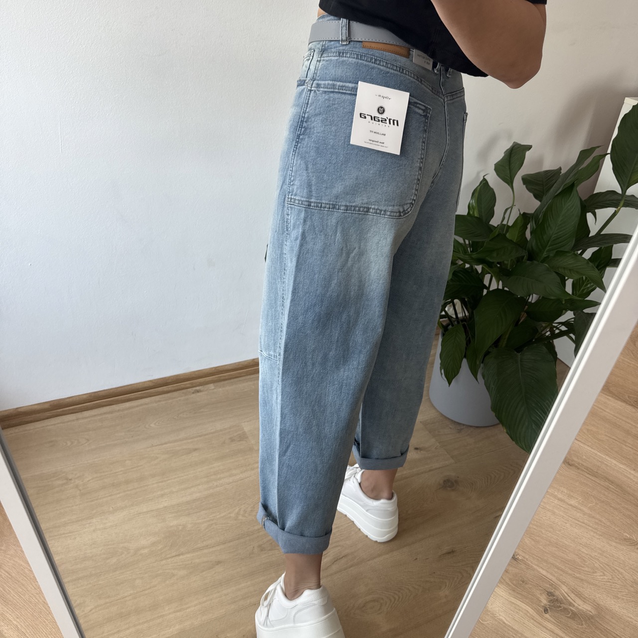 M.Sara Balloon Jeans – ciemny denim, wysoki stan, modelujące przeszycia i modne asymetryczne kieszenie. XS–XL.