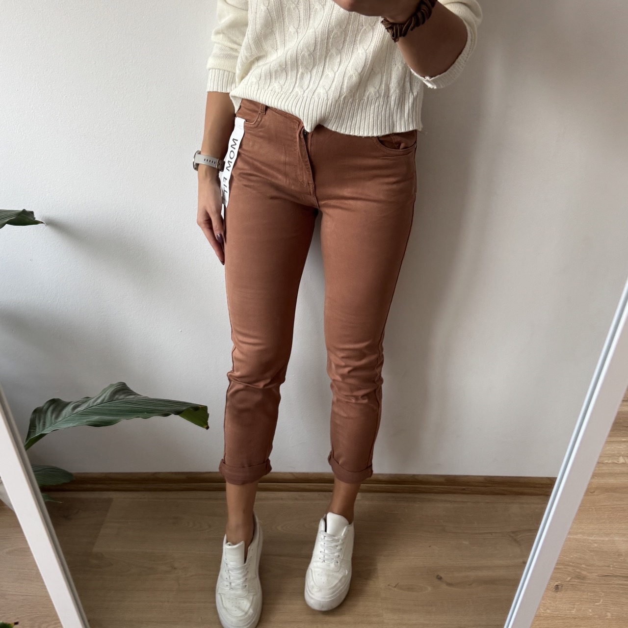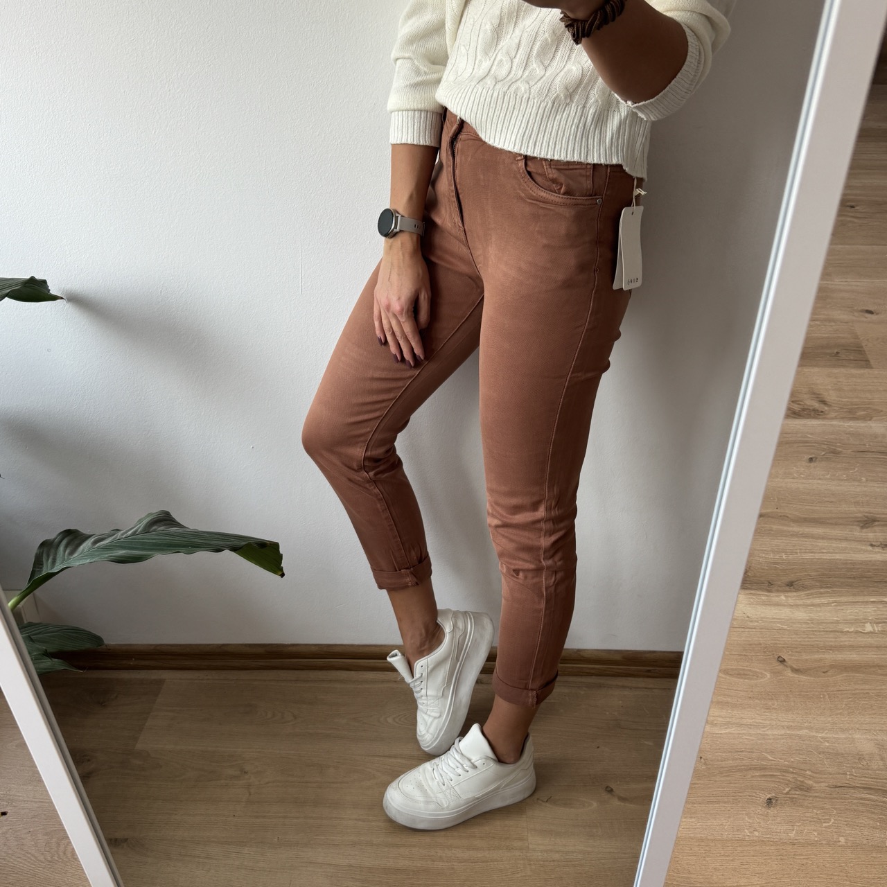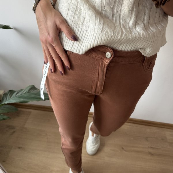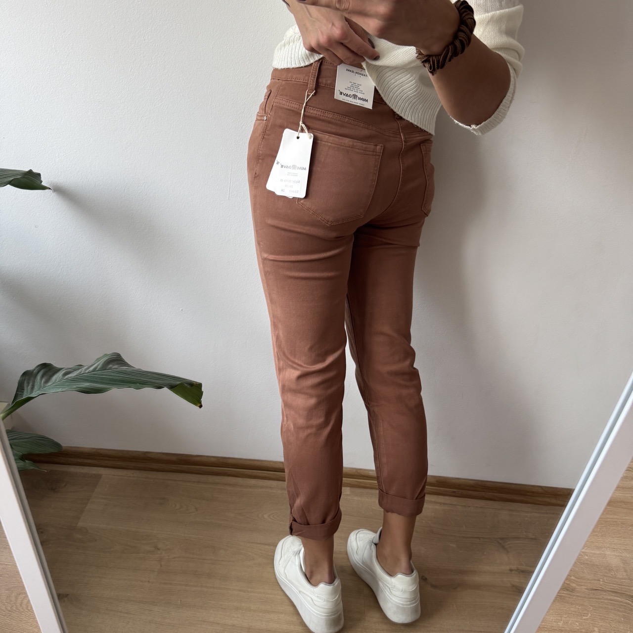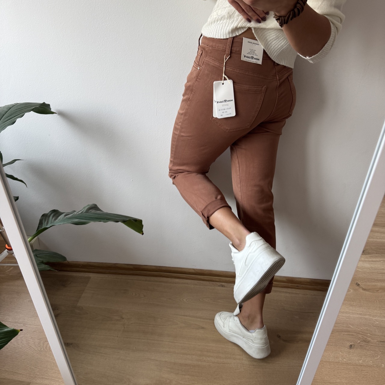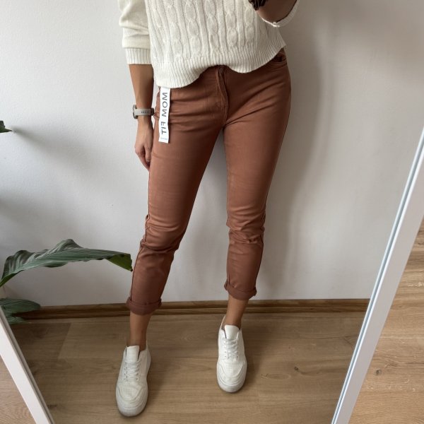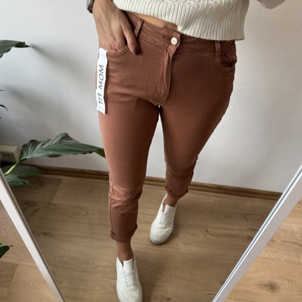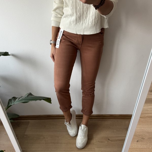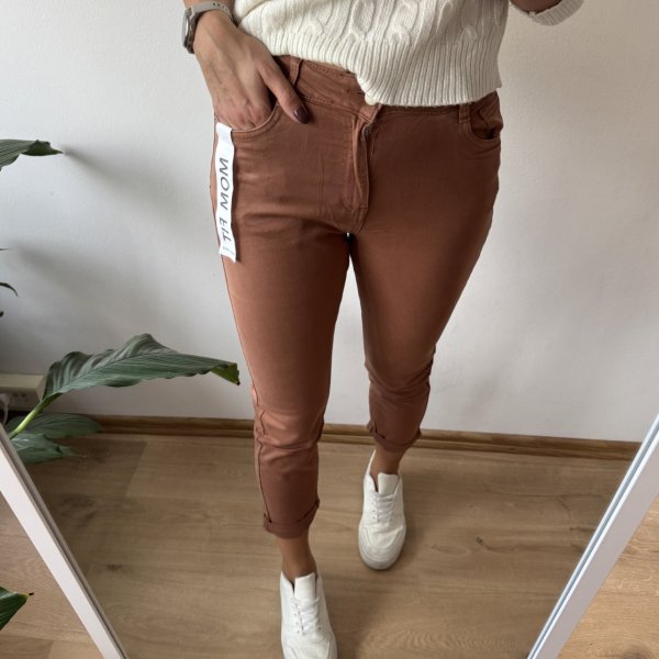 Stylowe jeansy Mimidave w modnym fasonie Mom Fit to idealne połączenie klasyki i wygody. Wykonane z miękkiego, elastycznego denimu, doskonale dopasowują się do sylwetki, nie krępując ruchów. Ceglany odcień dodaje im charakteru i sprawia, że świetnie sprawdzą się w codziennych, jesiennych stylizacjach.