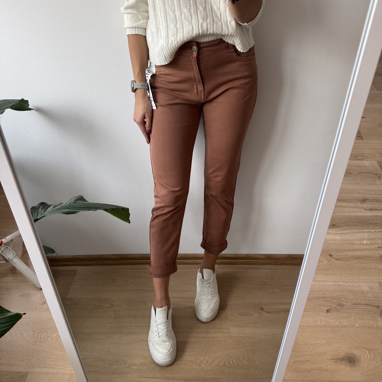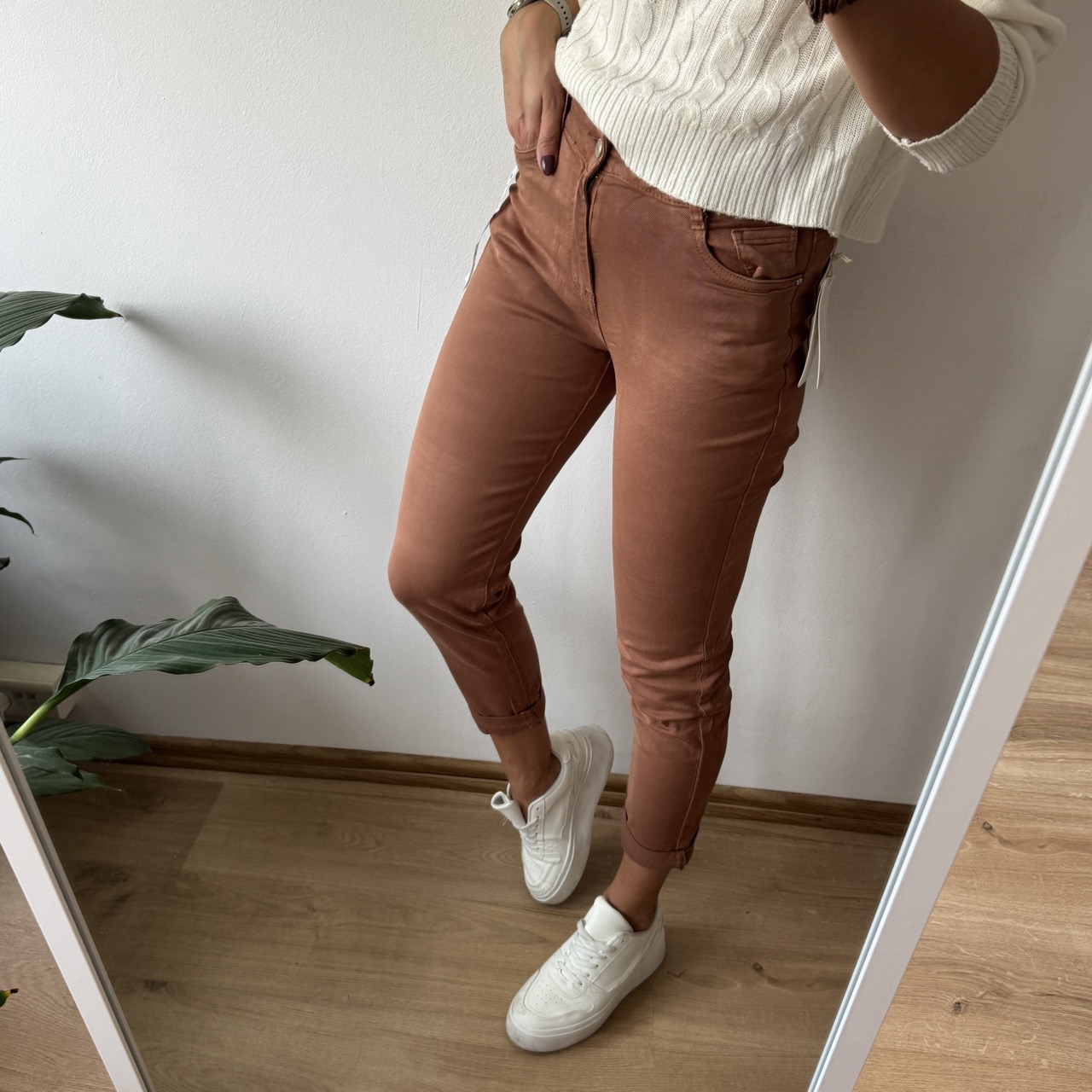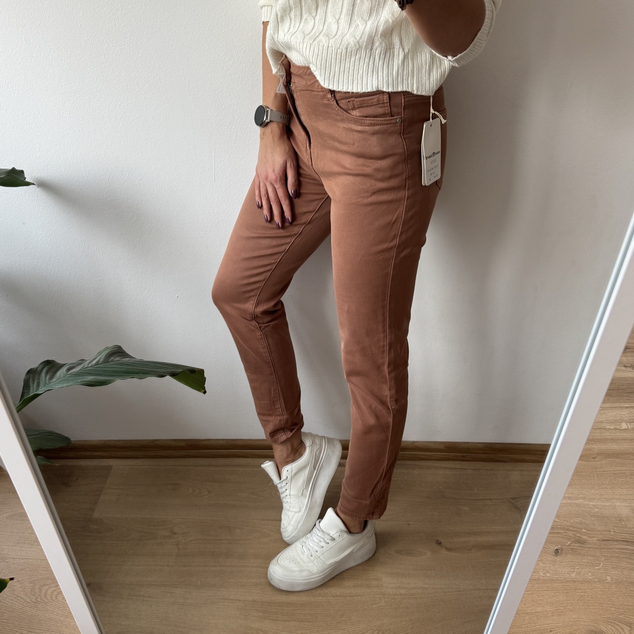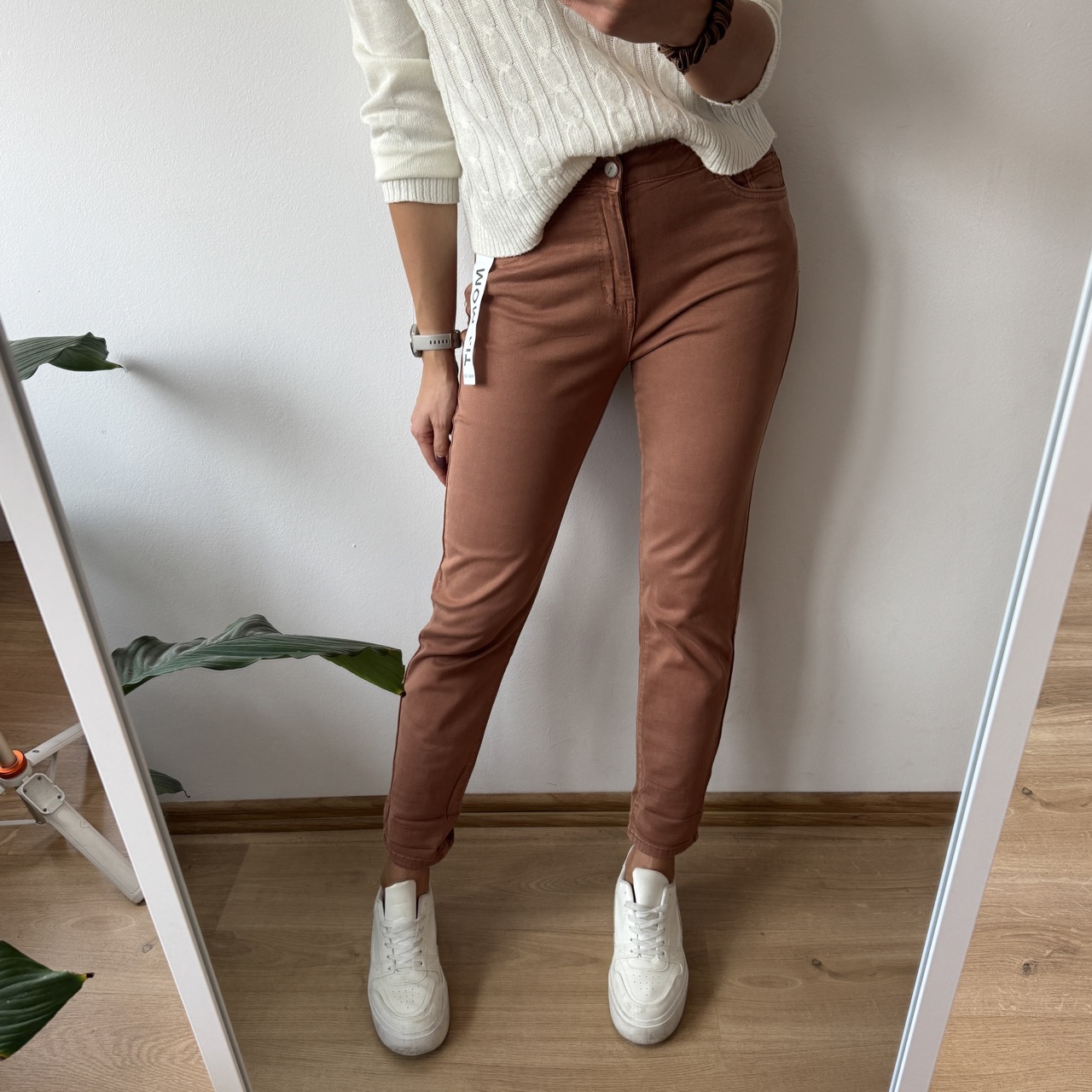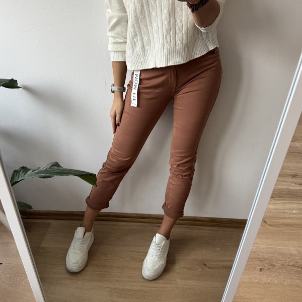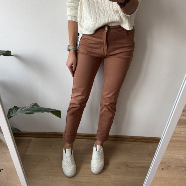 Stylowe jeansy Mimidave w modnym fasonie Mom Fit to idealne połączenie klasyki i wygody. Wykonane z miękkiego, elastycznego denimu, doskonale dopasowują się do sylwetki, nie krępując ruchów. Ceglany odcień dodaje im charakteru i sprawia, że świetnie sprawdzą się w codziennych, jesiennych stylizacjach.