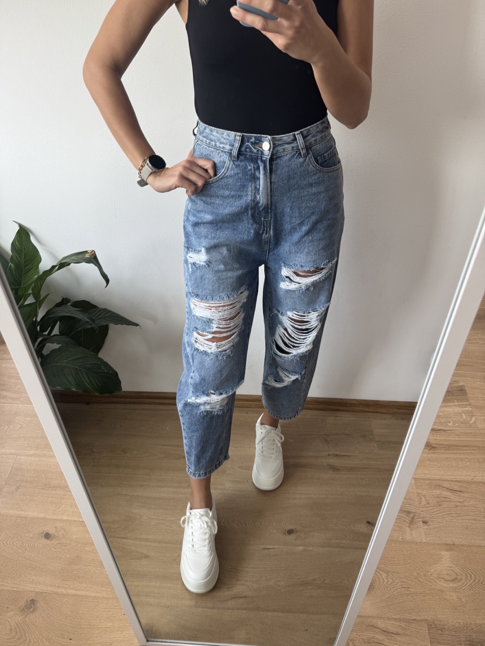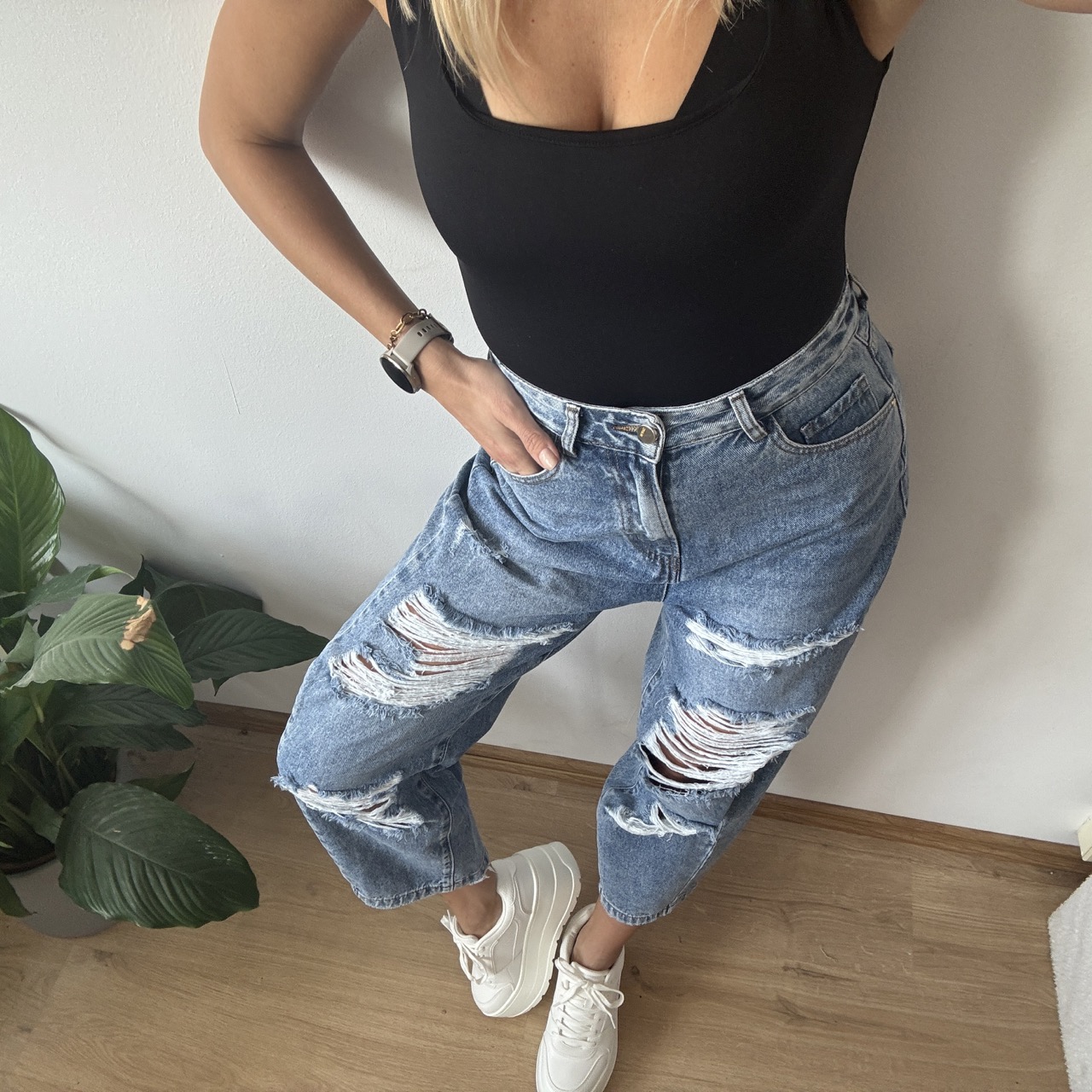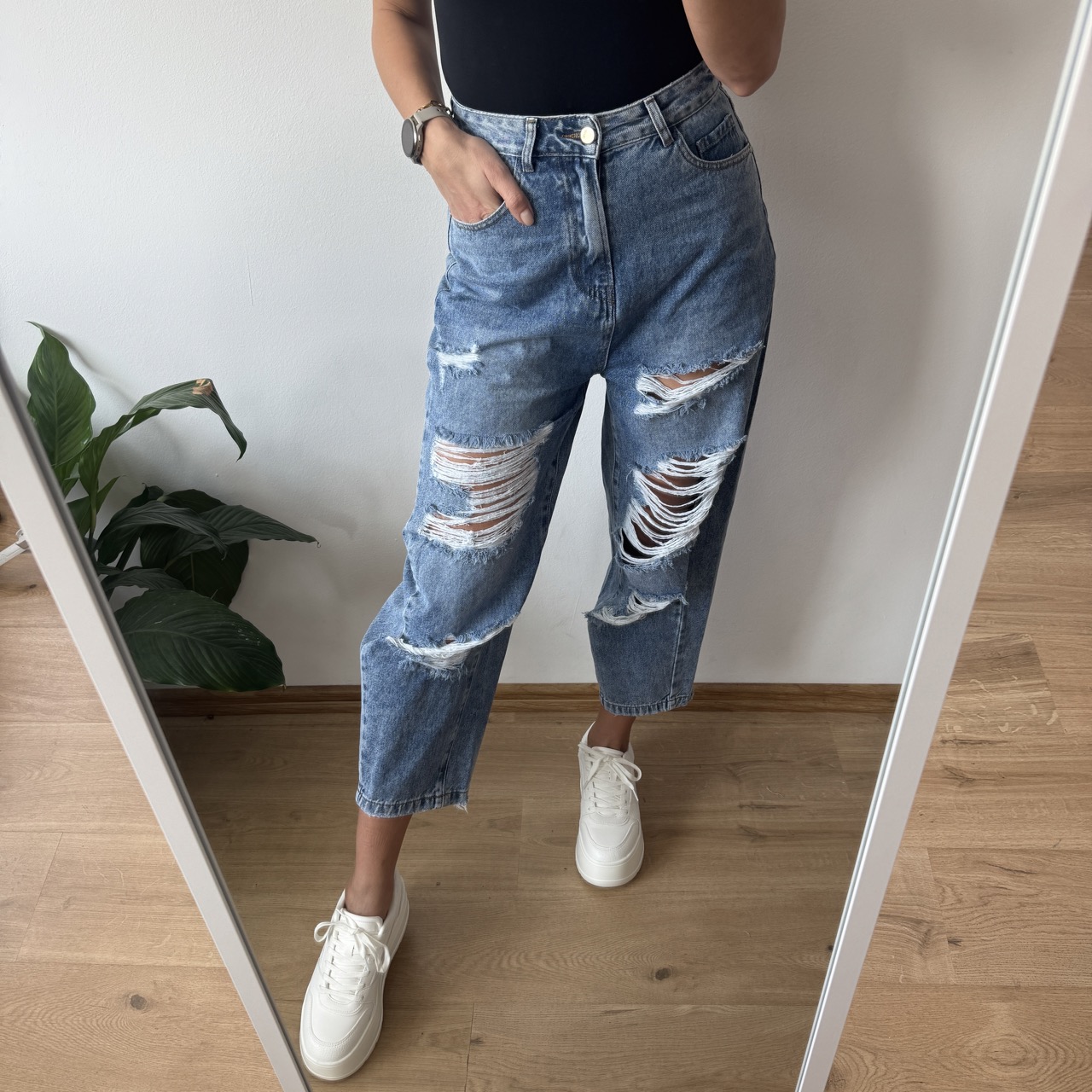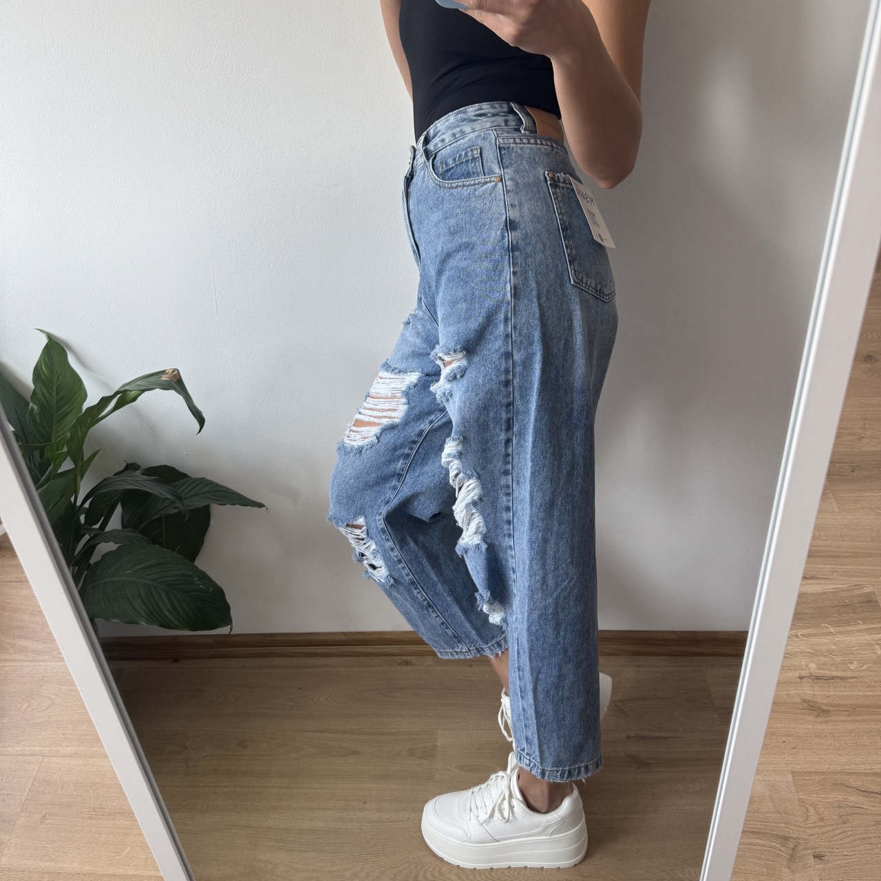 Jeansy zachwycają pięknym, jasnym kolorem, idealnym na wiosenno-letnie stylizacje. Charakteru dodają im liczne dziury i przetarcia, które nadają całości nowoczesnego, lekko streetwearowego looku. Fason balonów pięknie podkreśla talię i nadaje stylizacji oryginalnego charakteru.
