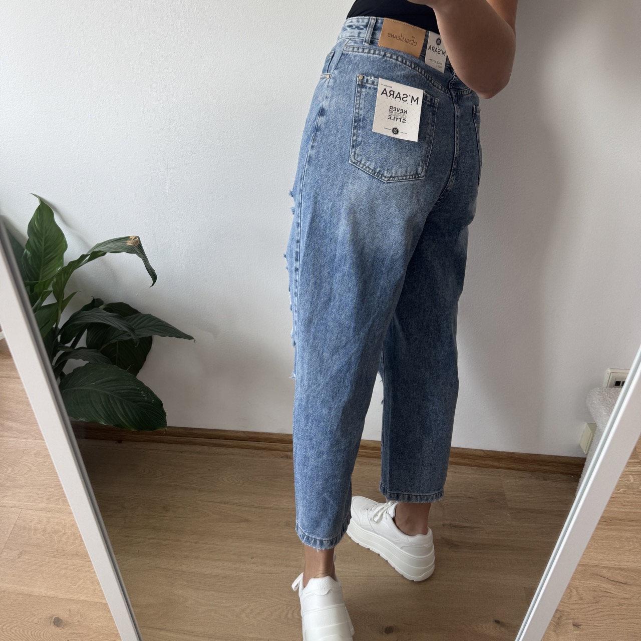Jeansy M.Sara Momfit – wysoki stan, elastyczny materiał, stylowe przetarcia i pasek w zestawie. Idealne dopasowanie i piękny jasny odcień jeansu. Rozmiary XS-XL. Wybierz swój styl już teraz!
