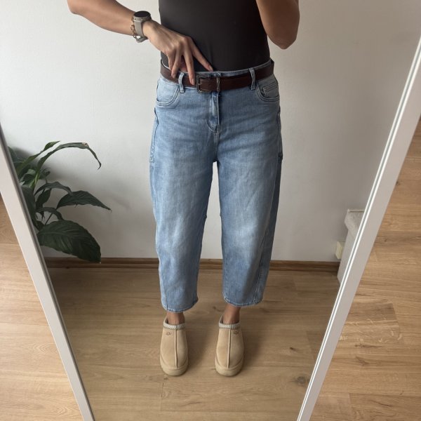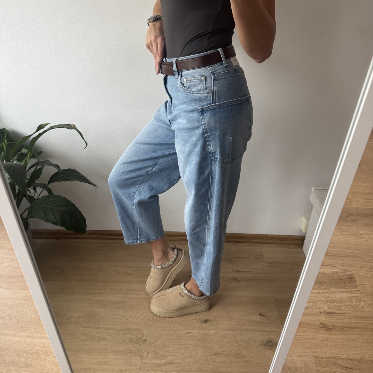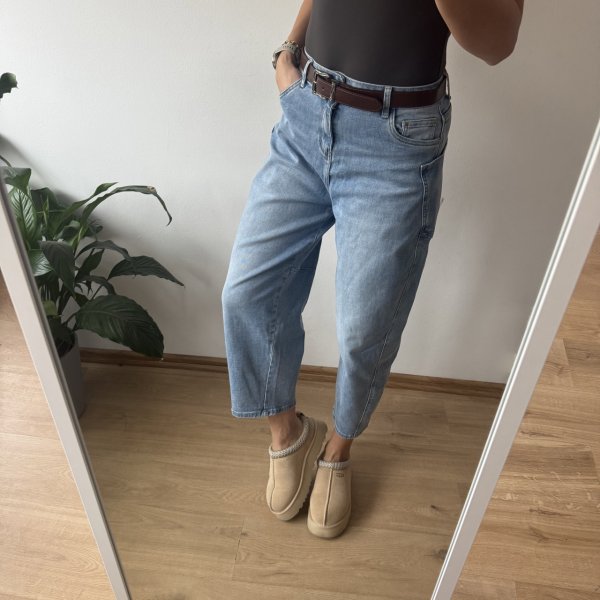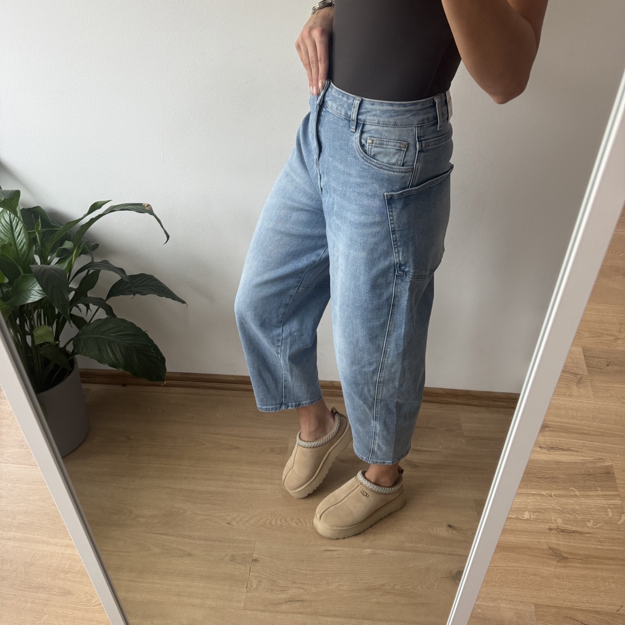 Jeansy M.Sara w głębokim, jasnym odcieniu to stylowy fason balloon jeans w nowoczesnym wydaniu. Charakterystyczne, podłużne przeszycia optycznie wysmuklają nogi, a asymetryczne kieszenie po bokach nadają całości oryginalnego, streetwearowego charakteru. Wysoki stan pięknie podkreśla talię, a luźniejsza linia nogawek zapewnia komfort noszenia. Dostępne w rozmiarach XS–XL – idealne dla kobiet ceniących modny design i wygodę.