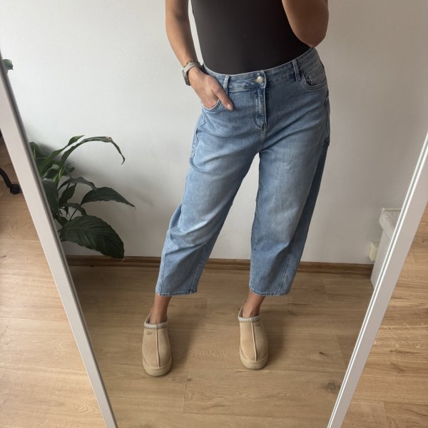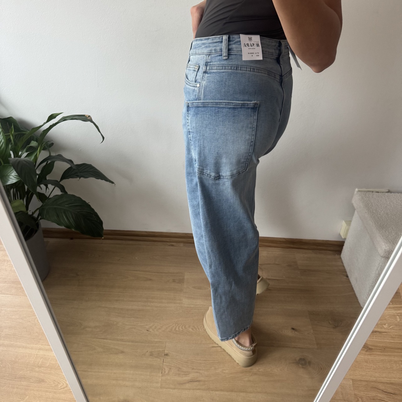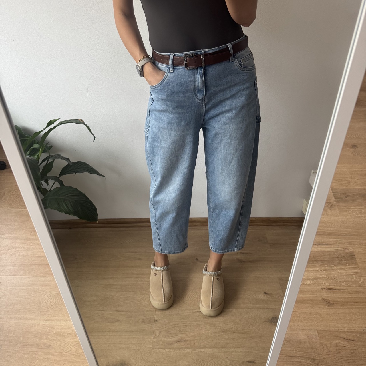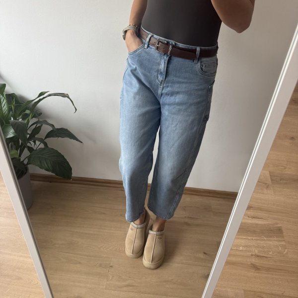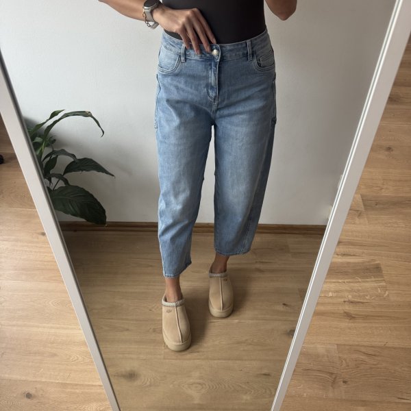 Jeansy M.Sara w głębokim, jasnym odcieniu to stylowy fason balloon jeans w nowoczesnym wydaniu. Charakterystyczne, podłużne przeszycia optycznie wysmuklają nogi, a asymetryczne kieszenie po bokach nadają całości oryginalnego, streetwearowego charakteru. Wysoki stan pięknie podkreśla talię, a luźniejsza linia nogawek zapewnia komfort noszenia. Dostępne w rozmiarach XS–XL – idealne dla kobiet ceniących modny design i wygodę.